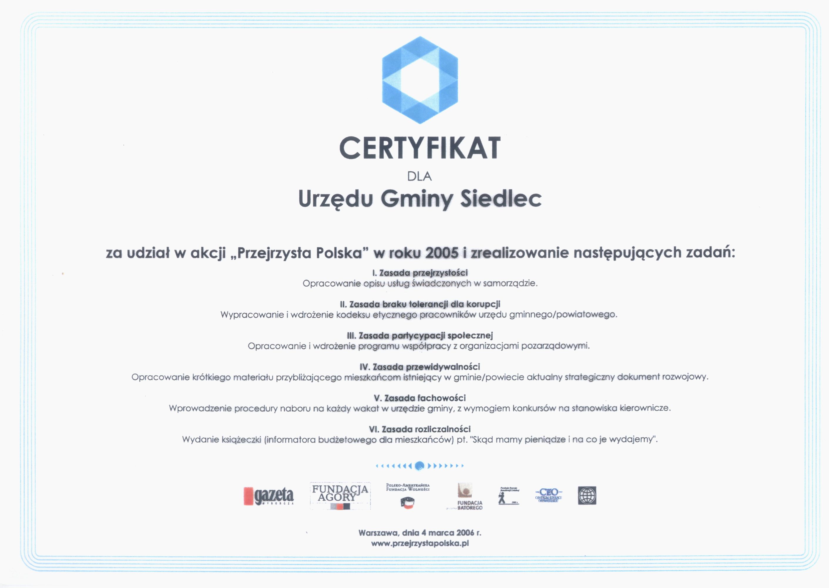 Urząd Gminy w Siedlcu przez cały 2005 rok uczestniczył w ogólnokrajowej akcji Przejrzysta Polska. Nadrzędnym celem tego programu było spowodowanie, że urzędy administracji samorządowej – uczestnicy akcji, realizując określone zadania obowiązkowe i fakultatywne, staną się przyjaźniejsze i bardziej życzliwe dla załatwiających w nich różne sprawy obywateli, a zatrudnieni w nich urzędnicy wolni będą od podejrzeń o działania korupcyjne. Uczestnictwo gminy Siedlec we wspomnianej wyżej akcji można było śledzić czytając „Gminne Wieści” lub zaglądając na witrynę internetową Urzędu Gminy. W tej ostatniej pod zakładką Przejrzysta Polska umieszczono szereg dokumentów ilustrujących zakres wykonanych prac. Formalnym efektem finalnym udziału Urzędu Gminy w Siedlcu w programie Przejrzysta Polska było przyznanie nam przez organizatorów akcji stosownego certyfikatu.